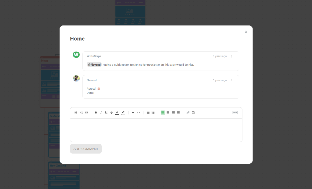 Effective communication is the backbone of any successful digital project. For agencies managing client delivery or internal audits, the ability to gather feedback directly on the sitemap eliminates long email chains and confusing spreadsheets. WriteMaps provides a built-in commenting system to keep all your project discussions in one centralized location.